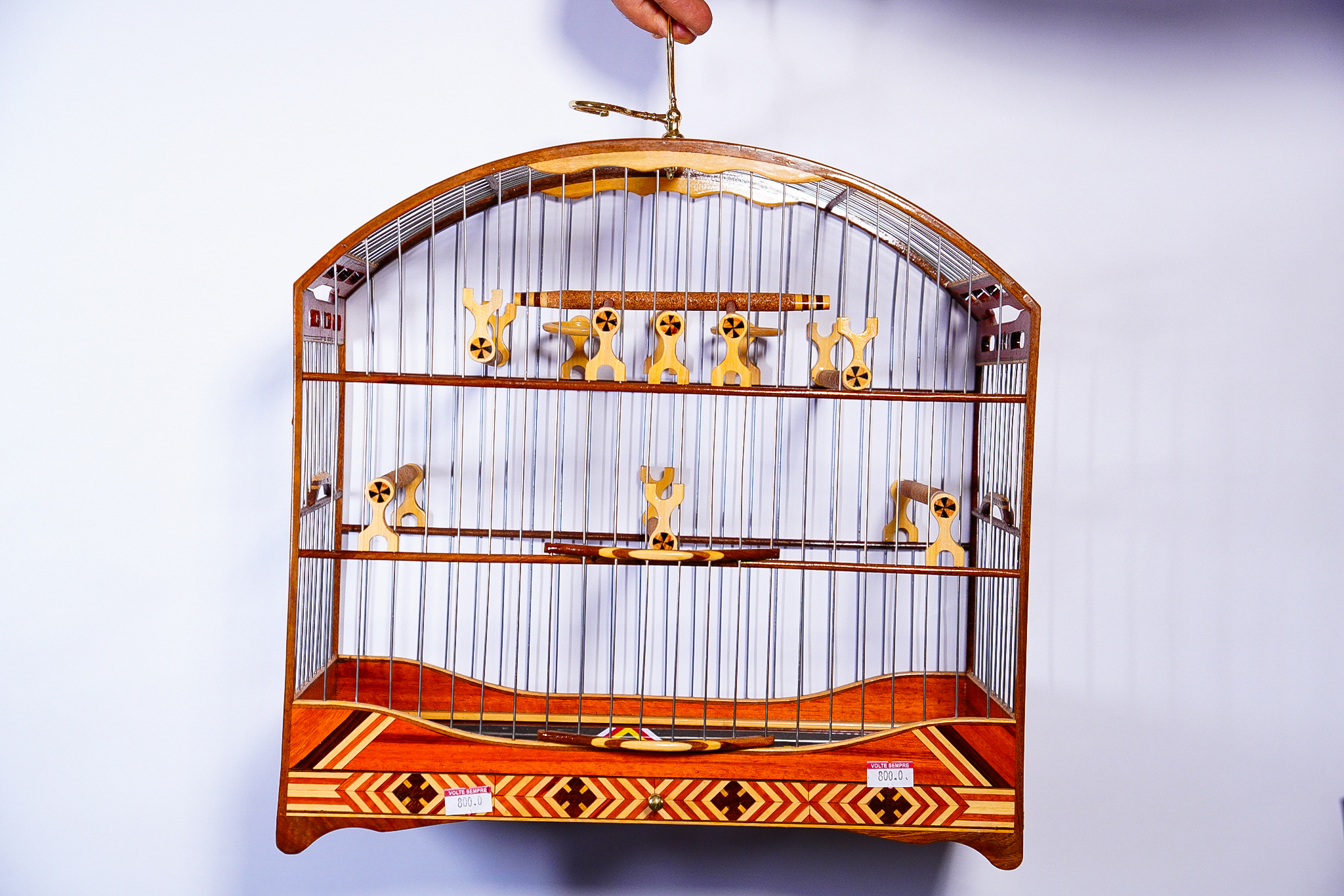 A parte inferior da gaiola tem um padrão geométrico colorido em tons de vermelho, bege e marrom escuro.